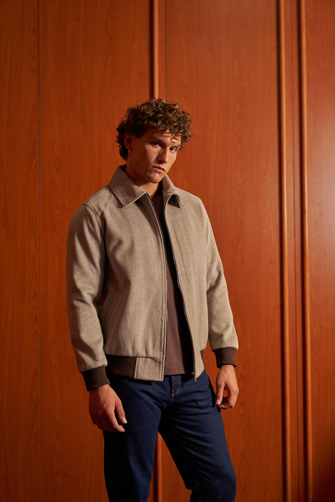Normal Kalıp Kaşe Balıksırtı Desen Fermuarlı Mont Manken Üzerindeki Beden : L Manken Ölçüleri : 185 cm 85 kg