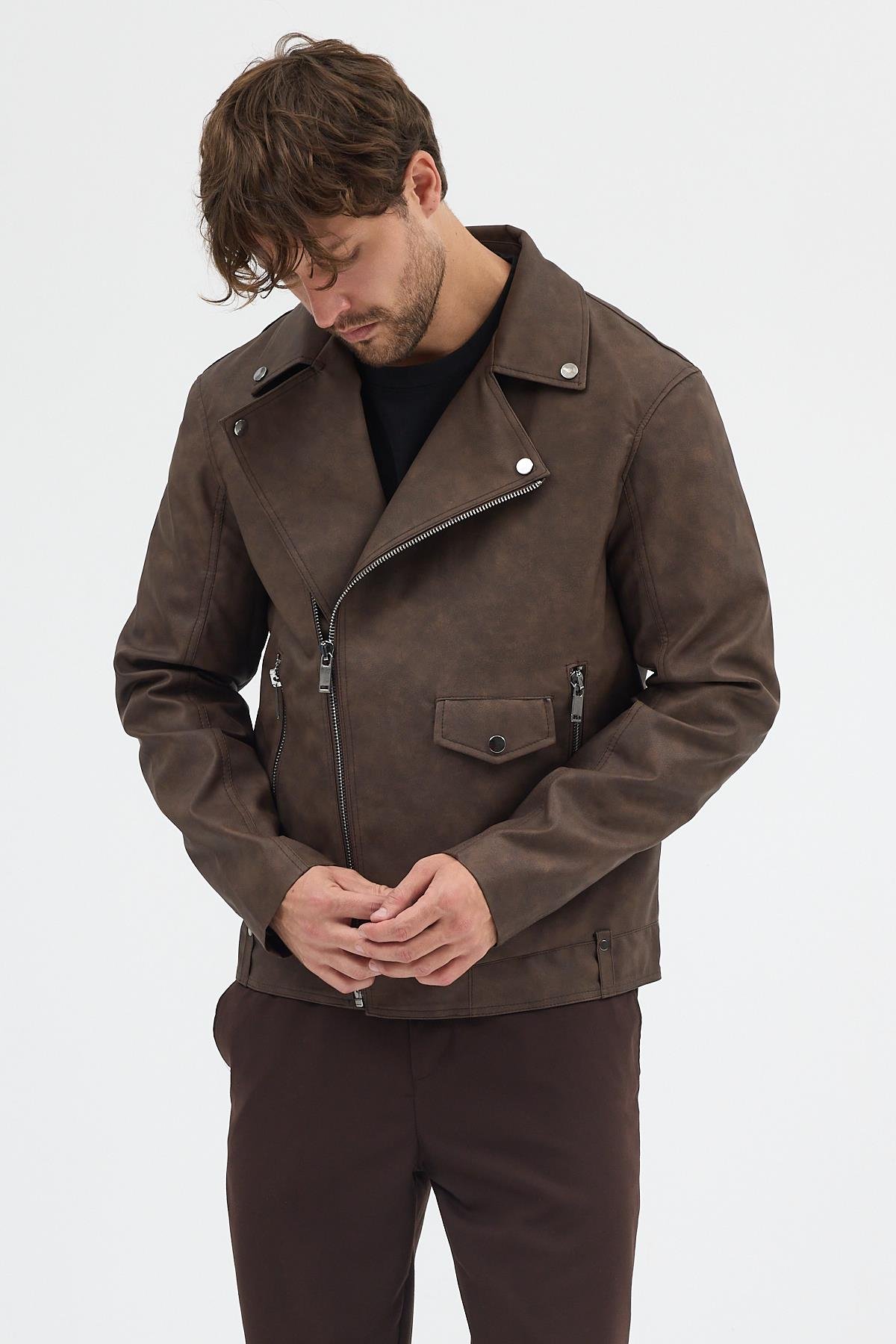 Deri Ceket Yıkamalı Biker Kahve Rengi (25ksmnt008)